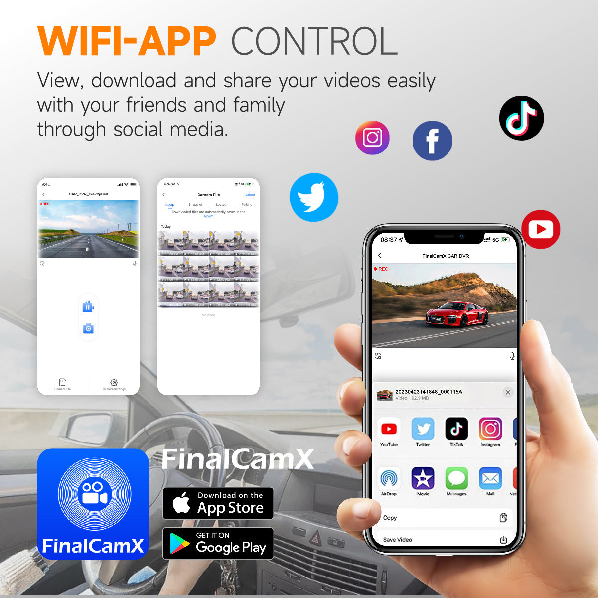 先進的 5G WiFi 技術讓您隨時保持連接,提供比傳統 2.4GHz 連接速度高達 4 倍的超快檔案傳輸速度。透過專用行動應用程序,即可將影片下載並分享到您的智慧型手機,非常適合在事故發生後立即與保險公司或執法部門分享證據。